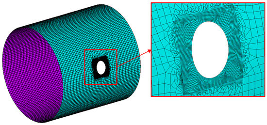The finite element model was built in the ANSYS® FEM environment using a subroutine written in the Ansys parametric design language (APDL). Indeed, a routine has been created able to generate all the possible configurations of the cylindrical shell with an elliptical cut-out, analyzed in this framework, by easily changing the geometrical parameters, such as eccentricity and semiminor axis length. The model was discretized by means of the Ansys® shell layered elements SHELL281 with eight nodes and six degrees of freedom at each node (translations in the x, y, and z axes, and rotations about the x, y, and z axes). Different mesh sizes were adopted to try to reduce the computational effort, preserving, at the same time, the needed accuracy in the cut-out region. In more detail, the optimized element size was found by means of a mesh sensitivity analysis and kept constant in the area with the highest element density, without taking into account the geometrical parameters variations. The model consists of 26,747 shell elements, with a size of about 6 × 6 mm in the area characterized by a coarse mesh, and a size of about 1 × 1 mm in the cut-out region. Figure 3 shows the Finite Element (FE) model, with the detail of the refined mesh in the hole’s area.