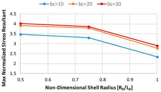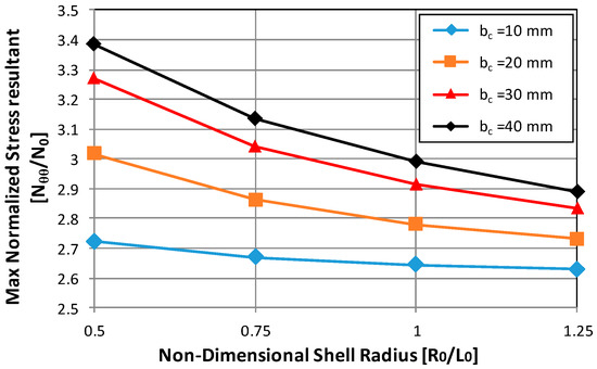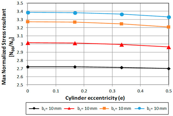 A first set of analyses was performed under the hypothesis of zero eccentricity for the cylinder and the cut-out (a = b; ac = bc). In Figure 6, the maximum stress near the cut-out is displayed as a function of the cylinder radius. Different configurations, with different cut-out radius (bc), were analyzed. The stress value was normalized with respect to the applied load (reaction to the unit traction displacement). According to Figure 6, the maximum stress value near the cut-out decreases as the radius of the shell cylinder increases, as expected. On the other hand, a significant growth in the maximum stress value near the hole is observed by increasing the cut-out size.