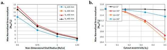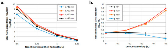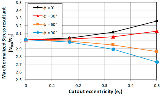 According to Figure 14b, which shows the max normalized stress versus cut-out eccentricity, an increase of the hole’s eccentricity leads, basically, to a decrease of the maximum stress, which strongly depends on the cut-out inclination angle.
