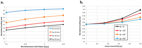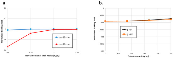A first set of simulations was carried out considering zero eccentricity for the cylinder and the cut-out (a = b; ac = bc). In Figure 18a, the buckling load was plotted as a function of the cylinder radius. Different configurations, with a different cut-out radius (bc), were considered. The buckling load has been normalized with respect to the buckling load of a cylinder with the same geometrical dimensions, but without cut-outs. According to Figure 18a, the buckling load growths as the radius of the shell cylinder is increased. On the other hand, a significant decrease in the buckling load is observed by increasing the hole size.