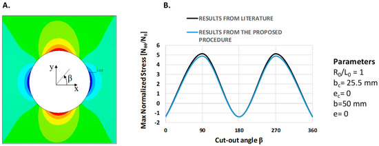 From the numerical analyses, the location which experiences the max normalized stress is identified, and the corresponding stress value is compared to the one resulting from the analytical procedure. The numerical–analytical results comparisons are listed in Table 6, where a maximum percentage error of 1.8% can be pointed out. Hence, this analytical relationship could be significantly useful in the preliminary design phase, when the hole size and shape need to be defined and its influence on the structural performance of the thin-walled components needs to be evaluated.