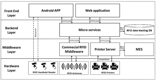 Furthermore, the middleware communicated with a mobile application. This one was based on an Android operating system, provided multichannel access to data with a business authentication system (OAuth 2.0 and SSL (Service Sockets Layer) based SSO (Single Sign-On services)). The application acted as a proximity reader (RFID reader) extension that allowed the detection of “scattered” RFID tags in the factory. The application was designed to be highly usable and the data was presented to be used immediately. For better support the understanding of the implemented solution, all the described elements are graphically represented in the functional architecture in Figure 2.