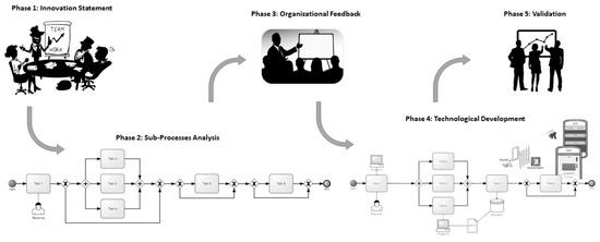 From the implementation point of view, this was translated into a greater demand for software logic to support operations with handheld readers: For this reason, a handheld reader to be linked with an Android or iOS smartphone via Bluetooth was chosen. The proposed technological solution allowed the creation of a solution more scalable and reusable for an extended enterprise context. In Figure 3, the steps followed to design and implement the technological innovation are resumed and represented.