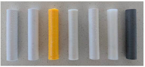 The seven fuel grains 3D-printed with different materials are shown in Figure 2.
