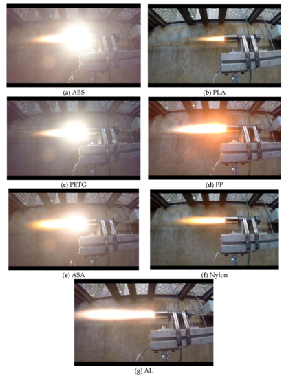 The initial series of fuel grains tested were manufactured from commercially available ABS, ASA, PLA, AL, PETG, Nylon, and PP. ABS has been selected as it has been shown to perform as well as HTBP at lab-scale static fire tests [2,9], while ASA was selected due to its similarities to ABS. The PLA was selected as a benchmark with which to test the Al, as there is currently no commercially available aluminum-doped ABS. PETG and Nylon were selected due to their excellent mechanical properties, which would be beneficial if they were used as a structural component of the rocket, and finally, PP was selected due to its low price and because it is a highly crystalline material. Table 1 describe the main characteristics of the seven materials tested in this study.
