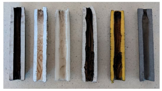 Cross section of each different small-scale fuel grain, left to right: ABS, PLA, PP, ASA, PTEG, and AL.