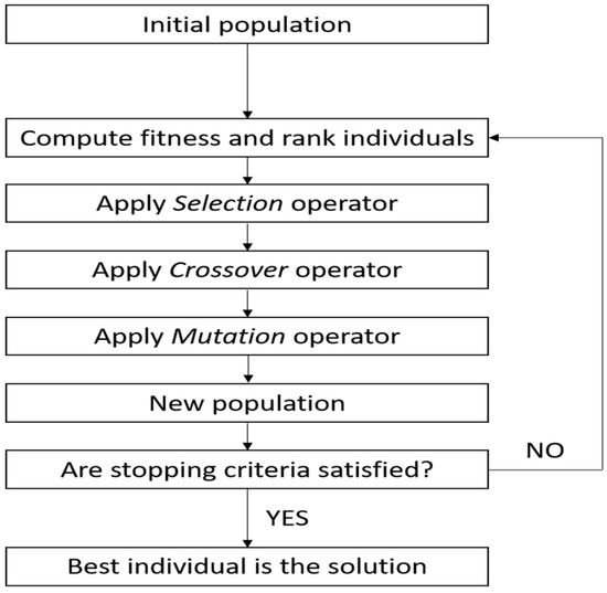Each iteration (or generation) of the algorithm evaluates the objective function (often referred to as the fitness function) of a population of points, called chromosomes or individuals. Each chromosome is a potential solution of the minimization; the individuals of each generation are then ranked according to their fitness, i.e., in ascending order of the corresponding objective function value. The best ranking individuals are chosen as parents for the next generation, which is composed by the best individuals of the previous iteration and new ones created using the operators called selection, crossover, and mutation. The process is repeated iteratively until a stopping criterion is satisfied, e.g., the best individuals are all within a tolerance (either in the objective function or in the space of chromosomes), a maximum number of iterations is reached, etc. A schematic representation of the process is given in the flow chart of Figure 4.