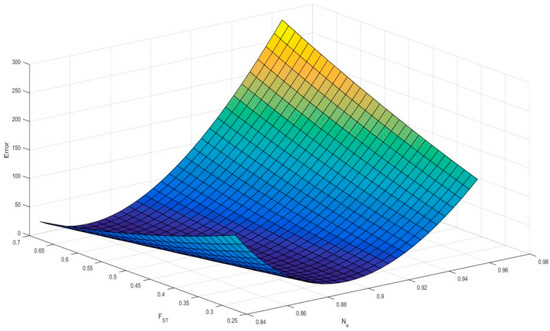 The detection of multiple faults requires to employ more robust algorithm than gradient based ones, hence in this work we propose the use of GAs. Moreover, the combined effect of two different faults affecting the system response at the same time can hide each other. As an example, while backlash and gain drift have very distinct influence on the behavior of the actuator, partial short circuit and dry friction affect the response in a similar way, i.e., modifying the motor speed for a given stator current. In particular, an increase in friction reduces speed for a given current, while a reduction of the healthy windings causes an increase in motor speed. Then, the fitness function plotted against friction coefficient and partial short (see Figure 5) has not a well-defined global minimum, since several combinations of FST and Na result approximately in the same minimum fitness value.