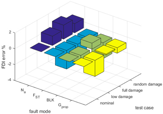 Table 3. FDI results for a low-level damage combination. - Full damage: A larger fault level results in a full damage, i.e., the system cannot meet its functional or performance requirements any more. This condition falls into the field of diagnostics since the system has already failed, and no estimation of Remaining Useful Life can be performed to plan a maintenance intervention. However, an FDI algorithm shall be robust enough to identify such conditions with acceptable accuracy, in order to trigger a corrective maintenance intervention. Results of these tests are reported in Table 4.