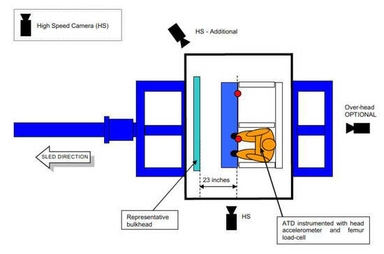 The seat cushions used during the test consisted of foam with the static deformation under the passenger weight set to a maximum penetration of 5 mm; a typical polyester seat belt was used. The sample full-scale sled test setup with the bulkhead is shown in Figure 2. A triaxial accelerometer was mounted at the center of gravity (c.g.) of the ATD head to determine the resultant head acceleration.