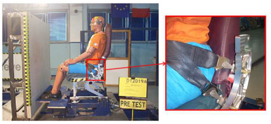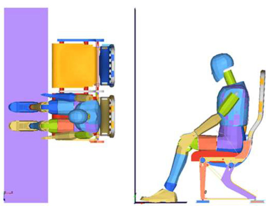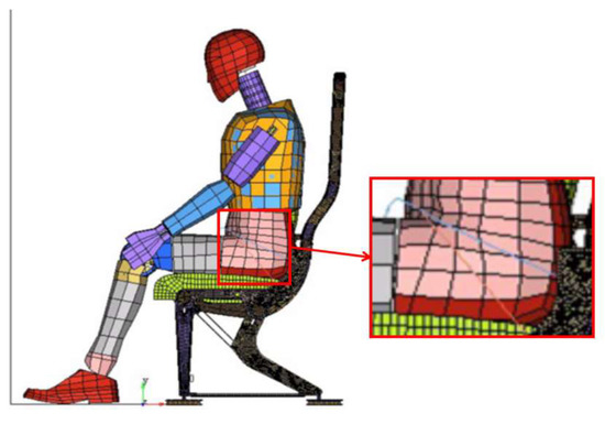 The validated FE model was used to conduct a second round of numerical experiments to investigate the stiffness characteristics of some seat components to obtain useful information for re-designing the seat to avoid head–bulkhead impact. Only a single modification was introduced in the FE model: the belt was replaced with a Y-belt (Figure 7).