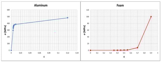 For each material, an elasto-plastic model was selected; the constitutive curves of each material are shown in Figure 5. The aluminum alloy adopted is an elasto-plastic material with kinematic hardening (model n. 24 Ls-dyna’s material library), and failure is defined based on the plastic strain. The foam material considered is a rubber-like foam of polyurethane. It is a simple one-parameter model with a fixed Poisson’s ratio of 0.25.