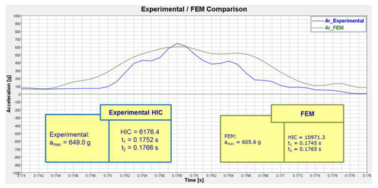Despite the good agreement between the acceleration peaks of the numerical and experimental head acceleration curves, the calculated HIC values were different. The difference in the HIC values can be explained taking into account that HIC is calculated choosing the extremes of the integration interval considering the whole acceleration head curve. Actually, as shown by Figure 7, the numerical and experimental curve trends are quite similar, but the corresponding areas are different.