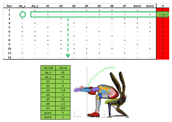 For the PB design adopted in our study, addressing the head–bulkhead impact in relation to the seat frame and the belt, nine factors were taken into account: X and Y coordinates of the Anchor point (APX and APY, respectively); the thicknesses of the Rear beam (D1), Rear leg frame (D2), Rear leg web (D3), Shock absorber (D4) and Reinforcing beam (D5); the width of the Rear leg frame (D6) and the length of the Reinforcing beam (D7). For cases of eight to eleven factors, the number of experiments, for a PB plan, is 12. However, in order to arrange the plan, all the eleven factors are necessary. The last two columns are two dummy factors (dumm1 and dumm2, respectively).