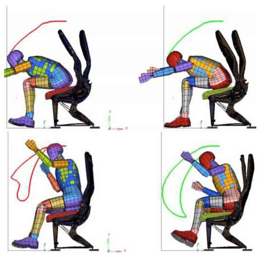 According to Figure 10, the red displayed head trajectory is representative of the head–bulkhead impact in the preliminary FE model, whilst the green one indicates the lack of contact in the new model. It must be noticed that the developed FE model is very time-demanding, requiring about 20 h for each run. This suggests the development of a new model, able to take advantages from both the FE and the Multibody (MB) (less time-consuming) approaches. In a previous paper, [8], the authors demonstrated that computational costs are reduced by up to 2 h using a hybrid FE-MB model, which simultaneously implements MB models, for system components whose deformations do not influence the dynamic system responses and for which only kinematic aspects must be investigated (e.g., anthropomorphic dummies), and FE models for the other system components.