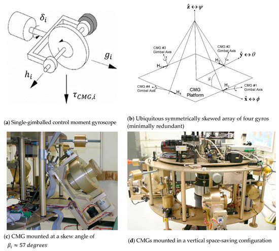Control moment gyroscopes (a) placed onto a spacecraft mounted at a skew angle, with depicted here (b) in the former research benchmark with minimally redundant (four) gyros arranged in the shape of a pyramid skewed at the symmetric angle, . Notice the reduced vertical space occupied by the gyros in (d) compared to the vertical space occupied by the gyro in (c). This vertical space reduction is one reason why engineers might need to understand configurations with one or more gyro mounted at disparate skew angles resulting in an asymmetric configuration.