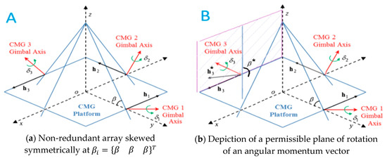 Typical non-redundant symmetric installation is depicted in Figure 2a, while recently developed asymmetric installation is depicted in Figure 2b. Skew angles are not normally modified after installation. The gyros are gimballed, and their gimbal rotations about their respective gimbal axes are expressed as . Gimballing rotates the angular momentum vectors in planes perpendicular to the gimbal axis, and these planes contain the respective torque vectors in a right-hand arrangement: angular momentum, torque, and the gimbal axis. The torque axis (τ) rotation for a CMG is the axis around which the spacecraft maneuver is accomplished. The torque axis and the orthogonal relationship between the CMG’s gimbal axis (δ) and angular momentum axis () can be seen in Figure 1. These relationships demonstrate how one may discover the torque axis and provide the intuition behind singularity generation in this configuration [48].