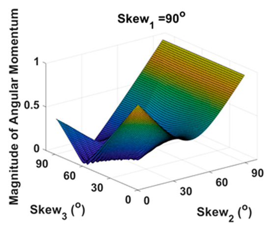 Figure 6 presents a three-dimensional version of Figure 5 (gyro #1 held at 1 degree) akin to Figure 4’s original presentation of gyro #1 held at ninety degrees. Meanwhile, Figure 6 moves away from singularity-free capability to focus on maximal (saturation) capability, but the iterations are similar: we iterate the skew angle of gyro #1 discretely, and present continuous (infinite) iterations of the other two skew angles. Table 3 contains the maximum yaw maneuverability skew angle combinations. The space mission motivating this research needed to maximize yaw maneuverability. While the analysis displayed in Figure 4, Figure 5 and Figure 6 provides (infinite) continuous optional alternatives for mounting gyros asymmetrically, the graphic depictions nonetheless can make it difficult to discern the exact capability of a discrete combination of asymmetric skew angles. To remedy this deficiency, the analyses of discrete options are listed in Table 4, Table 5, Table 6 and Table 7. For example, if a space mission dictates two that gyros must be set to a skew angle lower than ninety degrees, several discrete options are immediately evident, and some even maintain a very similar singularity-free momentum capability (e.g., yields 097h, while the box-90 configuration yields 1h).