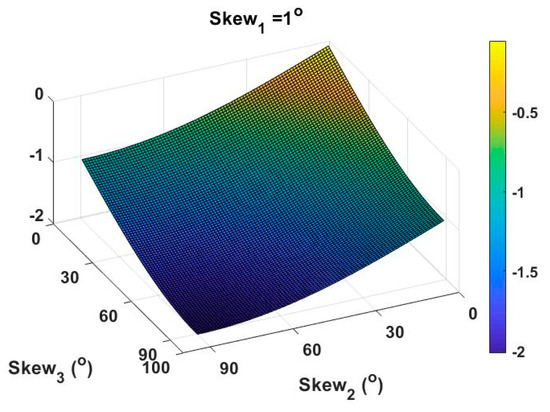 Inspired by the effectiveness of momentum space rotation of the “roof” configuration established by laying down the center gyro (gyro #2 here) to zero degrees, companion research by the authors [48] investigated issues that arise when using other combinations of low skew angles. Figure 5 is inspired by the companion research which claims peculiarities with low-skew angle combinations (albeit the “roof” configuration has proven quite effective). We take gyro #1 as the illustrative example, since it has a counterpart, gyro #3, which acts in a parallel plane. Immediately evident in Figure 5a is the fact that laying gyro #1 to a near-zero skew angle does not bestow a benefit unless one of the other gyros is also depressed (allowing near 1h capabilities). Notice how poorly the configuration performs if only gyro #1 is depressed, leaving the other two gyros at ninety degrees. As a matter of fact, the only favorable regions of Figure 5a are in the upper-left and lower-right corners, where one of the other respective gyros is also depressed to zero degrees. Another aspect evident in Figure 5 is the nature of the right hand side of each subplot. Notice that the far-right sides of the plots become only yellow (best performing) when skew angles all are beyond 60 degrees (precisely validating the discovery in the companion research that revealed peculiarities of near-planar momentum associate with low skew angles).