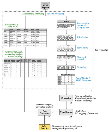 The methodology presented by this study can be visualized in Figure 1 and is described here in brief, with a more detailed treatment in the sections that follow. The approach is undertaken in multiple steps, beginning with the extraction of specific ASRS reports from its large database of commercial flight records, followed by the cleaning and pre-processing of both the narrative and categorical data to more effectively reflect the information contained within each recorded parameter. Subsequently, the cleaned text narratives are reduced to a bag-of-words and term frequency-inverse document frequency (TF-IDF) matrix, and attempts are made to classify these narratives using k-means clustering, while visualizing them through T-distributed Stochastic Neighbor Embedding (t-SNE). Finally, statistical methods are applied to the results of both previous steps, in order to identify which metadata parameters and values correlate most strongly with the class categories identified. The final goal of this methodology is thus to identify a set of class categories that thoroughly encapsulate the ASRS dataset based on the categorical parameters that appear to have the most significant impact on in-flight event narratives.