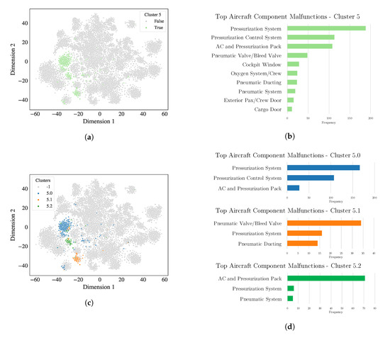 A similar analysis of distinct sub-clustering behavior is presented in Figure 5 for cluster 5, whose metadata indicates a strong presence of pressurization-related narratives. The structure of the figure is the same as that of Figure 4. The t-SNE visualizations of this cluster also seem to reveal at least three distinct visual groupings of points labeled under cluster 5, and this was confirmed by a deeper metadata analysis as seen in Figure 5d. Three distinct but related issues involving pressurization systems, pneumatic/bleed valves, and air conditioning are all placed within the same overall cluster, and each individual trend can only be analyzed more clearly through localized investigation of each group of points.