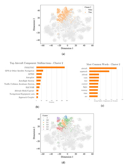 The sub-cluster breakdown of Cluster 2 can be seen in Figure 6d. Clusters that exhibit a similar behavior of loose boundaries and low metadata correlation require a subdivision into more sub-clusters in order to uncover distinct trends in metadata. It was found that the navigation and collisions topic can be broken down into five distinct sub-categories, namely: terrain proximity, turns and headings, approach phase of flight, air traffic control issues, and traffic collisions. This indicates a trend in less-defined clusters of correlating with metadata parameters other than the main aircraft component which malfunctioned. The presence of the approach phase as a key driving factor for a sub-cluster, along with air traffic control issues, indicates a need to explore additional less obvious metadata parameters in order to identify the main contributing factor for each cluster.