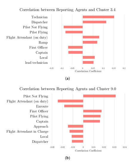 Despite a more rigorous hierarchy-based analysis of the clustering regime, a small set of sub-clusters still present a challenge due to a lack of clear trends identifiable through metadata bar plots. Sub-clusters 3.4 and 9.0, both belonging to large and indistinct overarching clusters, prompt further exploration through the correlation analysis outlined in the “Post-processing” section in order to identify driving factors. Results from this can be seen in Figure 7a,b, which show correlation between reporting agent and sub-cluster labels for clusters 3.4 and 9.0, respectively. Cluster 9.0 shows results similar to a majority of clusters, in that positive labels tend to correlate with reports filed by pilots. Differently, labels for cluster 3.4 tend to correlate positively with reports filed by technicians and dispatchers, and correlate negatively with reports filed by pilots, a trend not observed in any other cluster. The presence of this sub-cluster within overarching cluster number 3, whose driving factor is events related to Ground Operations, supports the idea that the points assigned to it could relate to either maintenance or ground traffic issues.