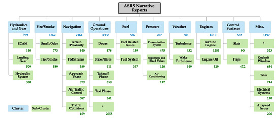 The procedures outlined in the previous section, when undertaken for every overarching cluster and sub-cluster, indicate that ASRS event narratives can be divided into 31 specific categories, each of which falls under one of 10 different overarching categories. Of these 31, only the two explored in Section 4.2.3 did not immediately possess a clear driving factor stemming from metadata bar plots. The hierarchical structure obtained can be seen in Figure 8. Blue boxes represent the overarching clusters identified through running the k-means algorithm on the entire dataset, while green boxes represent the individual breakdown when the algorithm is run on each cluster. The number at the corner of each box indicates the amount of narratives placed within this category. This allows for a thorough but succinct representation of the 13,336 narratives, each of which can be understood individually as well as in the context of the narratives which most closely align with it. The easy retrieval and study of individual categories of events is another benefit of this representation, allowing for metadata-based analysis on multiple levels of the hierarchy.