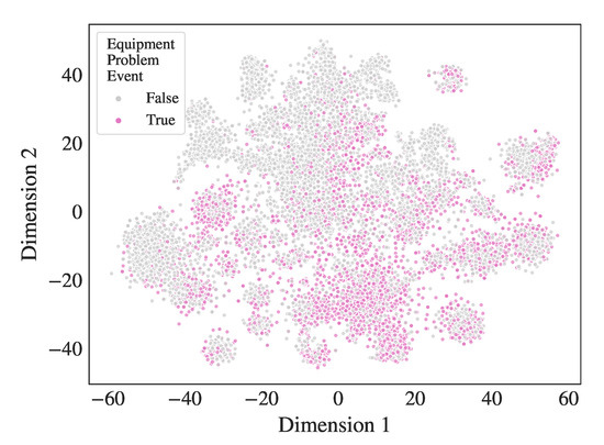 As outlined above, the dataset selected for this study comprises 13,336 ASRS event narratives, which are converted into a TF-IDF matrix representation and clustered through k-means. A t-SNE visualization of the narratives color-coded by cluster is seen in Figure 3. Each point corresponds to the TF-IDF representation of a single narrative, reduced to two dimensions. The colors represent the cluster assigned to that narrative by the k-means clustering algorithm. As outlined earlier, the axes of a t-SNE plot possess no physical significance, therefore the values for “Dimension 1” and “Dimension 2” cannot be taken to represent any specific characteristic of a narrative. However, the positions of points can be analyzed in a relative context. Weights assigned by the t-SNE algorithm based on original euclidean distance ensure that points placed close together in the visualization had a shorter distance between them in the high-dimensional space as well [41].