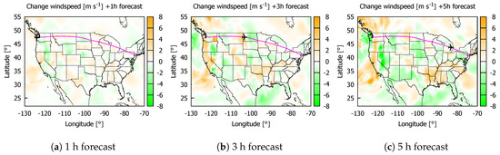 Increasing inaccuracy of weather forecasts shown as differences in wind speed [m s] between the used weather cycle (GFS, 31 January 2020, Cycle 00) before departure (a), and the latest available Rapid Refresh cycle during flight (b,c). More intensive colors mean more erroneous forecasts.