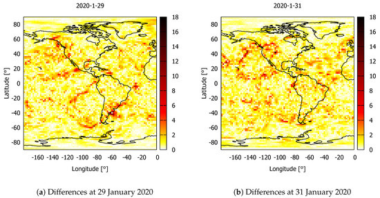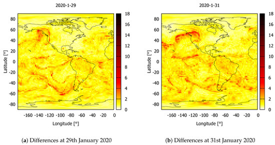 Mean differences in wind speed for 29th (a) and 31st (b) January 2020 between a six-hour GFS forecast and the corresponding GFS model output (six hours after the forecast has been calculated). On a global average, the GFS modeled mean wind speed deviates 3 m s from the AMDAR output of the same time.