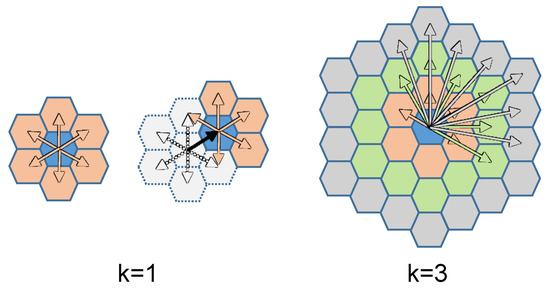 In the first step, an A-Star shortest path algorithm finds the cost-optimal flight path for a set of cruising altitudes between FL 310 and FL 400 considering the imported weather forecasts. The path is generated using a grid either with a variable spatial resolution, an Aeronautical Information Regulation and Control (AIRAC) cycle, or any other geospatial indexing system. In this work, the JAVA implementation of the hierarchical geospatial indexing system from Uber is used to grid the world (resolution step 5: equidistant spatial resolution of ≈15 km and neighbor rings) [21]. This grid uses hexagons, where each center of a hexagon is available for path finding. The left side of Figure 6 shows the path search with neighboring ring in two steps. By increasing k (right part, only one step), significantly more hexagons are included in the path search (). The higher the k, the larger the set of possible direction changes available while the computational effort increases at the same time. It does not allow for choosing an arbitrary direction change, but the options are significantly higher compared to a common global grid (i.e., a discrete spherical coordinate system), especially in the case of a small resolution for the hexagons.