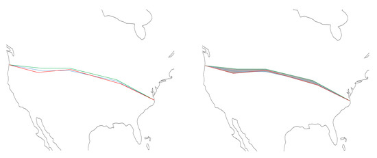 Figure 9 depicts the CoO described by a set of 380 geographic coordinates for a sample flight on 31 January 2020. The GEFS-optimized flight paths have an average ground distance of 3920 km ( = km) and an average air distance of 3519 km ( = km). The minimum cruising altitude is 206 hPa (≈380 FL), and the maximum is 194 hPa (≈390 FL). To avoid altitude-dependent fluctuations in the fuel consumption, the altitude is fixed at the average value for the subsequent fuel-saving potential computations. The CoO has a maximum width of LW = 259 km, which can be reduced significantly to LW = 71 km by removing the three northernmost flights.