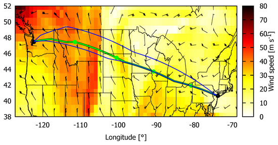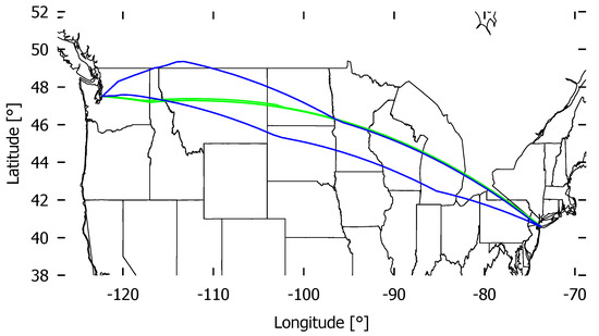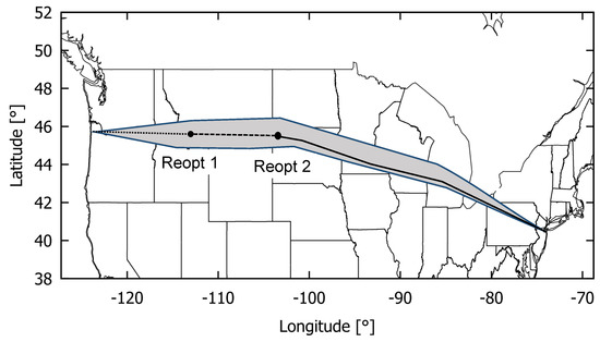 In addition to the CoO, an initial trajectory must be defined to fulfill today’s ATM concept and to provide an ATC and operational flight plan. Although common methods can be used to identify specific robust trajectories (e.g., trajectory with the lowest sum of total operating costs in each ensemble forecast, as pointed out in Section 1.1), this work follows the current flight planning procedure, as it defines the reference trajectory as calculated in deterministic weather forecasts (here: GFS. However, this trajectory is neither necessarily the optimum for each weather ensemble nor in the real atmospheric conditions, so an in-flight optimization should be applied in any case.