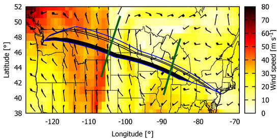 In [5,14], Lindner et al. presented the implementation of in-flight optimization in the TOMATO core. There, the trajectory was re-optimized from the present position as soon as the hourly weather update was received. Ongoing from these studies, this work uses RAP forecasts provided for the United States in a spatial resolution of 13 km and 50 vertical layers. It should be noted that RAP uses a regional Lambert conformal conic projection grid. For the usage with TOMATO, the grid had to be transformed into a global latitude-longitude grid with 0.5° spatial resolution using the tool WGRIB2 (https://www.cpc.ncep.noaa.gov/products/wesley/wgrib2/) and equal vertical layers.