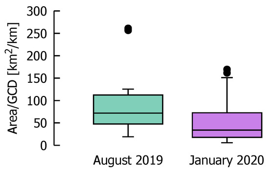 Comparison of CoO area per km great circle distance (km2 km−1) for August 2019 and January 2020. The outliers shown here result from significantly increased CoO, often caused by one ensemble trajectory. Ignoring this for the sake of remaining air space capacity would reduce the area.
