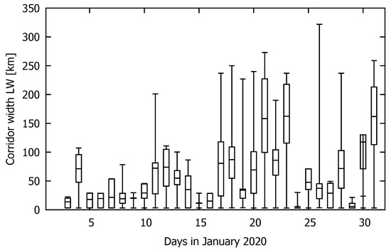 Figure 13 shows the average area AR needed for each month as a box plot, where Figure 14 gives more details in LW for all CoO from January 2020. To summarize, there is a tendency for the unrestricted in-flight optimization to leave the CoO with large lateral dimension more often (due to the greater weather variability).