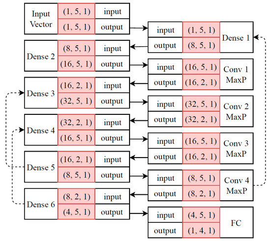 Since the dimensionality of our input training data is low, , a connection is set from the fourth convolution layer to the first dense layer in order to rectify the gradient vanishing problem. “Gradient vanishing” refers to any operation which may give a “zero” value to the gradient information. If gradient vectors vanish, then no weight vector can be updated. As shown in our previous networks, the last layer of the RNN’s final mapping is fully connected to the output.