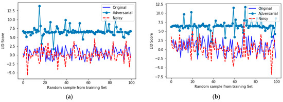 Figure 6 shows the LID score comparisons for random samples chosen from the training set. As this figure indicates, original and noisy samples lie in the same LID subspace, which denotes their structural similarity. Conversely, adversarial samples are located in a separated upper subspace different from the original and noisy sets. To demonstrate that these LID scores were also statistically different, we trained an LR in order to classify LID scores of original, noisy, and adversarial samples. Obviously, higher values of accuracy of the trained LR mean better classification for LIDs. We summarize the details of the LR in Table 4 as well as other training information.