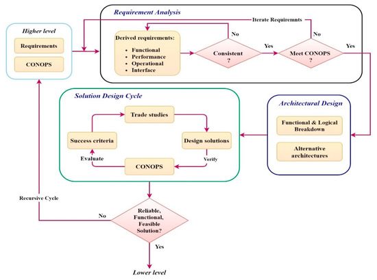 Within these objectives, we established in a previous work [1] a generic framework by tailoring the ECSS system to define a feasible and reliable architecture for the Masat-1 mission, while addressing the peculiarities and inherent risks in the operational context of aerospace projects. The full ECSS standard was beyond the scope of low-cost Cubesat missions such as Masat-1. Therefore, ECSS standard tailoring ensures the efficient development and testing of Masat-1 proto-flight within the scope of the project budgets and boundaries. ECSS standards were chosen over SMAD—space mission analysis and design standard system, that was proposed by the National Aeronautics and Space Administration (NASA), because they offer comprehensive and user-friendly guides to the management and development processes throughout the mission life cycle. Within this framework, we adopted an iterative and recursive systems engineering approach, to cope with the eventual changes and updates during the design and development process (Figure 2). This approach shall also facilitate the functional breakdown of Masat-1 systems to a level of detail, concrete enough to easily elicit high-level and derived requirements, to identify, prioritize and manage Masat-1 mission criticalities, to implement the smallest component and identify interfaces and task flows, and then to integrate it into larger subsystems until the proto-flight has been assembled, tested and validated.