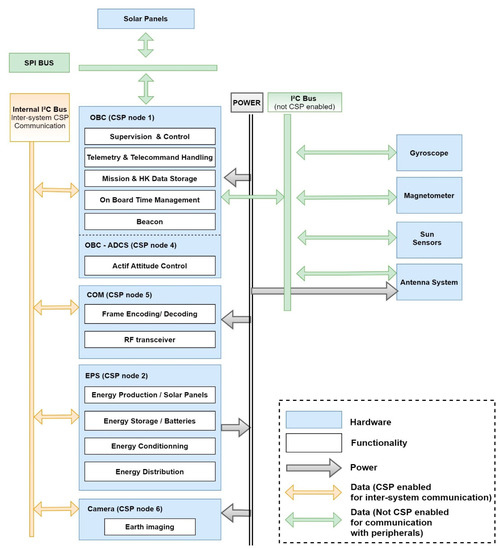 - Asundi, S.A.; Fitz-Coy, N.G. Design of command, data and telemetry handling system for a distributed computing architecture CubeSat. In Proceedings of the 2013 IEEE Aerospace Conference, Big Sky, MT, USA, 2–9 March 2013; pp. 1–14. [Google Scholar]