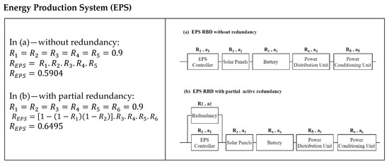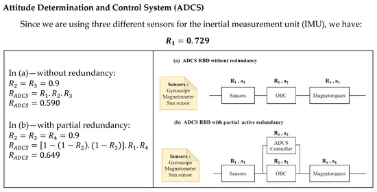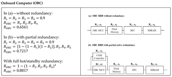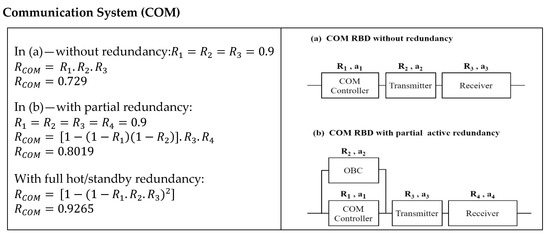 The RBDs with partial and full redundancies are compared to RBDs without redundancy for each subsystem in Figure 5, Figure 6, Figure 7, Figure 8 and Figure 9. In partial active redundancy, subsystems’ controllers are shared, or a secondary MCU might be used. However, full redundancy refers to using a separate secondary module in hot/standby mode, such as a secondary transceiver or OBC. Table 4 summarizes the RBD analysis findings. All subsystems’ reliability rates decreased when compared to the individual components reliability of 0.9. The reliability of the EPS and the ADCS are the lowest. Assuming 0.9 as the baseline, EPS and ADCS reliability reduction is 34.4%. This is mainly because many blocks are serialized since they are all necessary for the required function. Therefore, the failure of any block results in performance degradation or subsystem failure if no hardware or software redundancies are supported.