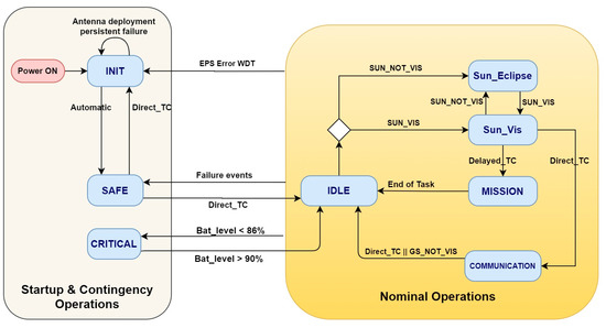 Definition and refinement of the mission CONOPS is a continuous and iterative process. It is important for the software developers to understand what events need to take place, and in what order, to execute a successful mission. The first step to define a spacecraft concept of operations is the freezing of the mission operational modes to which satellite subsystems operational states shall be defined. Then, software developers shall select either an open or closed mode concept for the spacecraft concept of operations in respect of predefined mission autonomy levels. During each mission phase, the spacecraft shall be in different states where relevant subsystems are switched to diverse operational modes. In an open mode concept, the entire spacecraft is commandable to a target mode via ground TC—e.g., Swampsat mission concept of operations [27]. The safe hold is an infinite loop that is interrupted when a TC from the ground is received to switch to one of the following modes: ADS, CMG, Detumble or Comm. The sequencing of actions is ruled by ground TC.