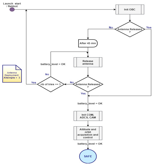 INIT mode: upon the launch of the satellite from the P-POD and the separation of the kill-switch, the EPS and OBC systems are powered up. The flight-control software then enters the INIT mode at the power ON pseudo-state in Figure 11. It is also the starting point for any satellite restart due to power blackouts, failures, ground commands or watchdog resets. The boot counter is then updated to keep track of the satellite reboot count. The antenna system deployment mechanism is designed to be executed 45 min after launch. This is to protect the main subsystems and payload from any interferences and to avoid damaging the antenna in case the satellite was still close to other launcher payloads. A “deployed” flag was used to track the antenna deployment state. In the case of unexpected failures, three attempts to redeploy the antenna were planned after which the satellite was rebooted in case the antenna deployment failure persisted. After a successful deployment, the COM, ADCS system and the payload were initialized. The rotational rate damping of the satellite was performed to stabilize its attitude; the satellite initial attitude was acquired, and the attitude and orbit correction maneuvers took place to point the antenna to Earth. Thereafter, the Masat-1 shall enter safe mode during which the satellite is totally commandable. In this mode, no downlink telemetry is generated.
