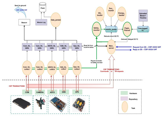 To further enhance Masat-1 software architecture modularity (Q1), we adopted a service-oriented pattern coupled with a finite state machine to execute Masat-1 mission functionalities in a deterministic manner. Moreover, every functional requirement was broken into well defined modules and concurrent tasks with simple interfaces and uniform APIs to communicate messages in the form of commands and requests. This messaging system was based on a client–server model, and it relies on CSP networking infrastructure. This enabled efficient inter-process and inter-node communication. This approach provided an intuitive way to implement Masat-1 functional requirements in a modular manner, where each task handles a particular functionality in a loosely coupled manner. For instance, to provide the onboard and ground monitoring of Masat-1 health state during its lifetime, the onboard software must be able to collect and persist onboard housekeeping data periodically. As it is depicted in Figure 13, dedicated collector tasks ensure these functionalities for each subsystem. Housekeeping data are collected from all subsystems using uniform CSP interfaces. Furthermore, housekeeping data are saved in tables to provide ground operators with immediate and easy access to housekeeping data. To keep these tables updated and readily available at all times, housekeeping collector tasks run periodically; then, a “Persistor” task saves the data to a binary file in the Flash memory. The service-oriented architecture enables requirements/functionalities encapsulation in services/commands, hence ensuring a modular design of the Masat-1 command system. These services are data structures containing all the necessary information to execute the target code, such as function handlers and data parameters; and they are invoked using uniform API thanks to CSP messaging system. All commands are stored in “Masat-1 services repository”, and they are identified by the target system node and a numerical ID. Moreover, their implementation is specific and independent; thus, command functional testing can be carried out separately. In this manner, services/commands can be easily added, removed or modified. Also, neat separation between mission generic and specific services can be achieved.