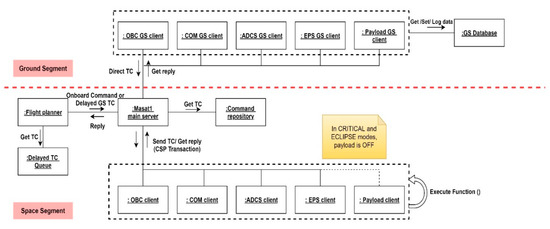 The architecture core modules are the main server, flight planner and the clients because they implement the command execution logic, which is illustrated by the UML communication diagrams in Figure 14. Packets are received using the main server task. When a CSP packet is received, its HMAC key validity is checked; the software should process and execute ground commands after authenticating their source and rejecting any invalid or illegal packets. This is to protect the satellite against any misuse. If the packet is valid, then it is either directly executed, where a direct message is sent to the adequate client using a CSP transaction, or it is added to a priority queue. Certain commands need to be executed at a time when the satellite is out of the control station range. To enable this type of event scheduling, commands are stored in a priority queue of delayed commands and executed at the specified time/event. Thereafter, the flight planner can pop commands to be processed one at a time during the Sun-Vis mode only when enough power is available for any mission-related maneuvers. It is worth mentioning that direct commands received from GS have the priority over delayed TCs. Finally, the main server calls the adequate function to generate command and requests to be sent as CSP messages to subsystems clients, and it increments several telemetry points, such as counters of valid and invalid received packets. In summary, enhancing the flight software modularity (Q1) will intrinsically ensure its reusability (Q3), extensibility (Q4) and flexibility to any further design modifications, thus supporting the incremental and recursive development of Masat-1 flight software.