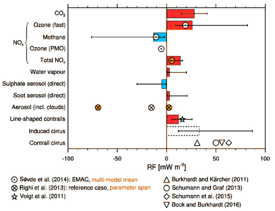 - Burkhardt, U.; Kärcher, B. Global radiative forcing from contrail cirrus. Nat. Clim. Chang. 2011, 1, 54. [Google Scholar] [CrossRef]