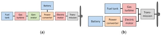 Schematic of a hybrid-electric propulsion system: (a) series configuration, (b) parallel configuration [].
