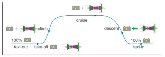 An example power management strategy adapted from []. During taxi-out/taxi-in phases, 100% electrical power is used, whereas during take-off, climb, and cruise conditions, battery and turbofan engine are used in parallel. The arrow on the mission profile indicates different flight stages.