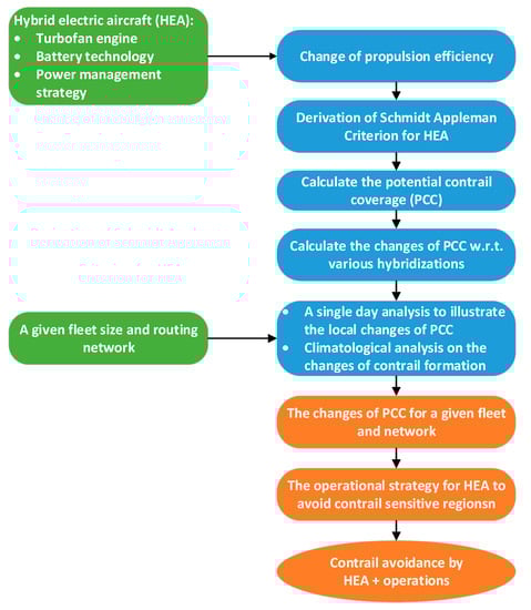 A schematic of a research methodology map to investigate the potentials of flying a hybrid-electric aircraft (HEA) for contrail avoidance.